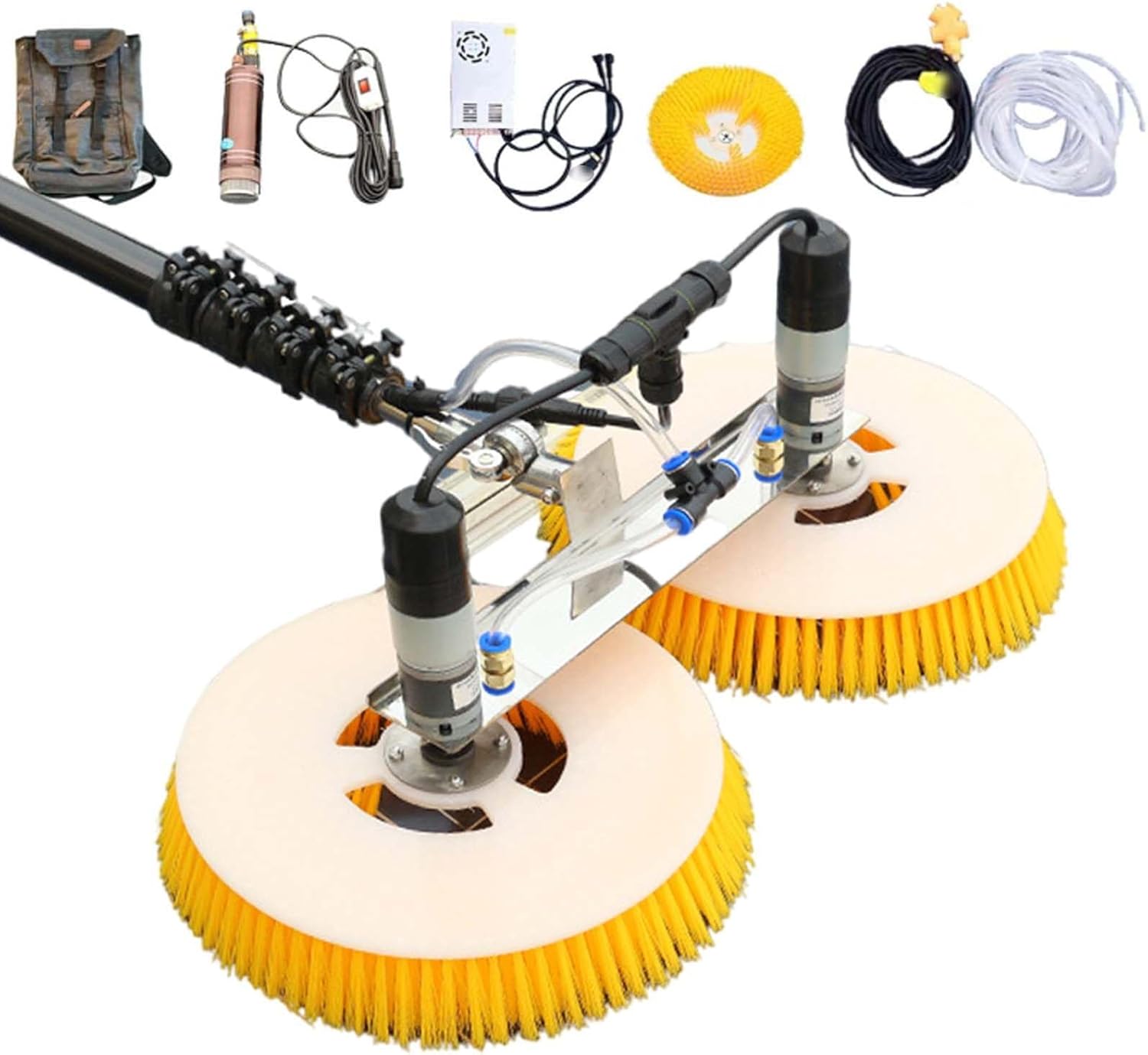 Designed for commercial environments like factories, solar plants, and remote mountain stations, our electric photovoltaic cleaning machine features 70 cm dual brush heads and a balanced power for stable, efficient cleaning; Its innovative design conserves water (1.5-3L/㎡) while covering 500-750㎡ hourly (3,500-5,000㎡ daily); The ultra-lightweight carbon fiber telescopic rod (5-8m length options) with a secure locking mechanism minimizes user fatigue, while high-density, hand-woven brush heads ensure thorough cleaning without damaging panels●PRODUCT PARAMETERS●Name: Double Head Electric Photovoltaic Cleaning BrushPower: 240 WRod length: 5 m(16.4 ft)/6 m(19.7 ft)/7 m(23 ft)/8 m(26.3 ft)Power supply mode:【Wired】【Dual Use(Wired + Supply Powered)】Working time/Charging time: 4-8 h/10-12 hProduct material: Carbon fiber rod + High-density fiber brushBrush head width: 70 cm【5 m/16.4 ft】Size: 160 x 40 x 20 cmWeight: 13.5 kg【6 m/19.7 ft】Size: 160 x 40 x 20 cmWeight: 14 kg【7 m/23 ft】Size:180 x 40 x 20 cmWeight: 14 kg【8 m/26.3 ft】Size: 180 x 40 x 20 cmWeight: 14.5 kg●PACKAGE LIST●【Wired】1 x Electric Photovoltaic Panel Cleaners Brush1 x 10m power cord1 x 10m water pipe line1 x Water pump1 x Power1 x Backpack【Dual Use】1 x Electric Photovoltaic Panel Cleaners Brush1 x 10m power cord1 x 10m water pipe line1 x Water pump1 x Power1 x Supply1 x Backpack●NOTE●Delivered in two packages
