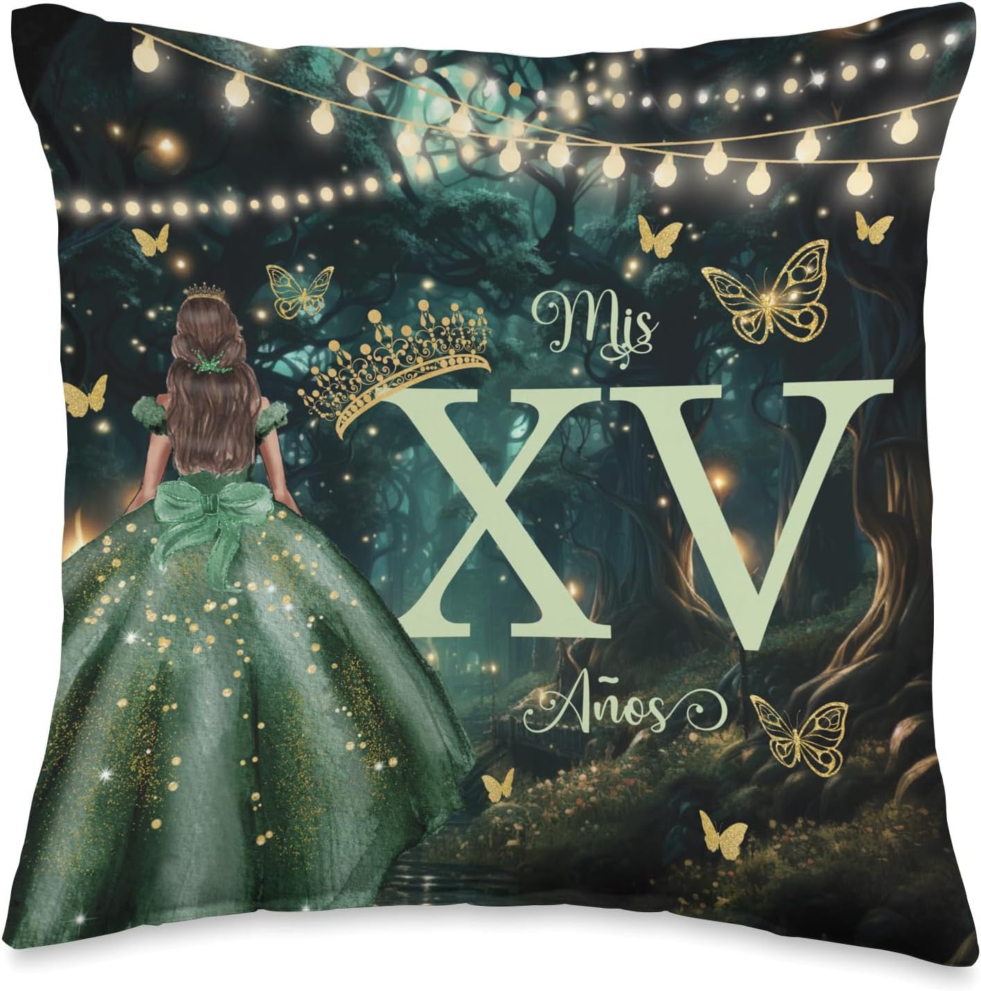 Fifteenth Birthday Celebration Celebrate your special day with our exquisite keepsake cushion, featuring a quinceañera girl in an emerald green ball gown, butterflies and a whimsical enchanted forest backdrop. The cushion is adorned with "Mis XV Años" headline. This beautifully designed cushion makes a perfect keepsake for your quinceanera, adding a touch of elegance and charm to your celebration