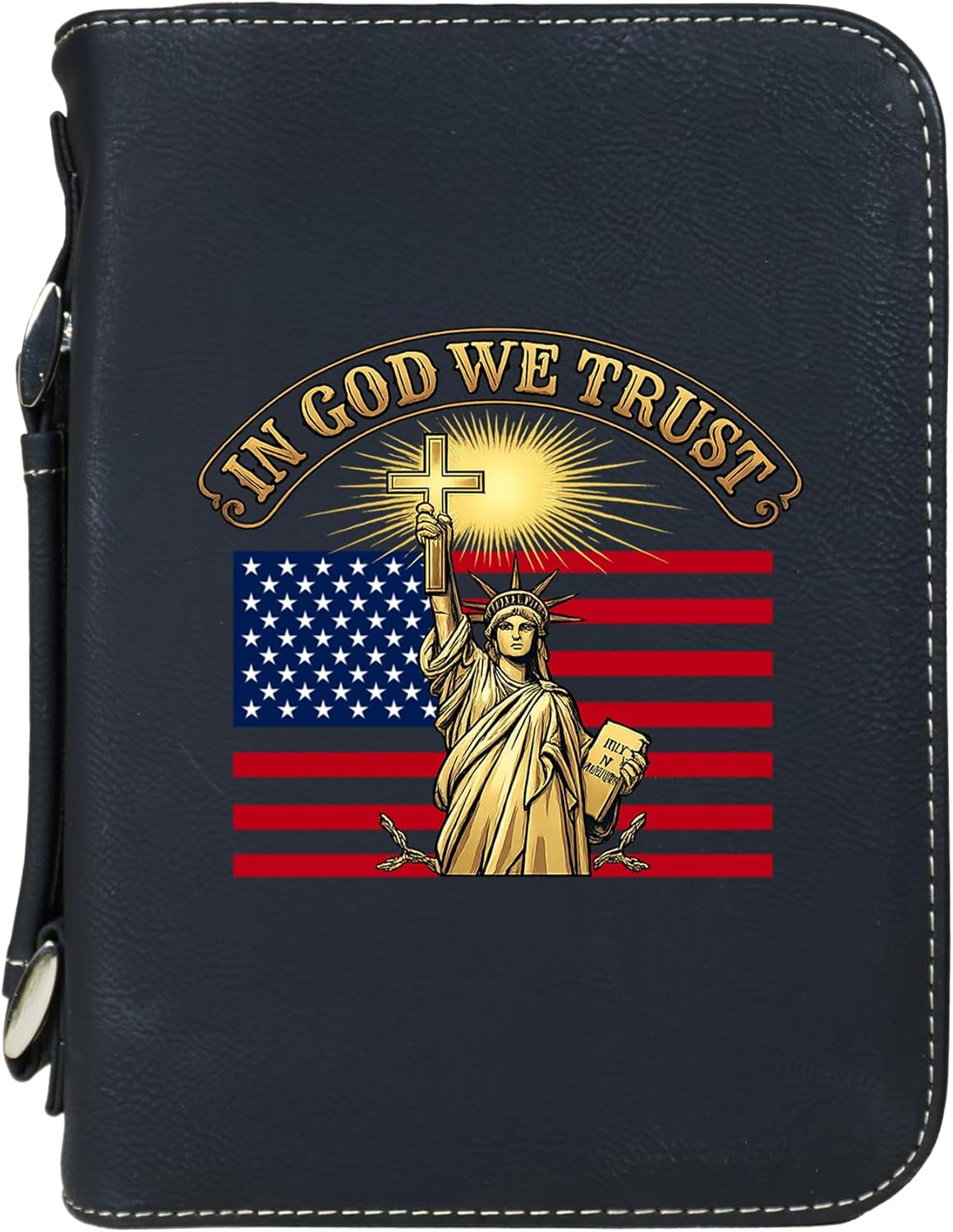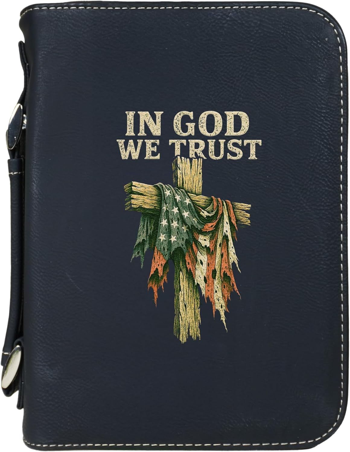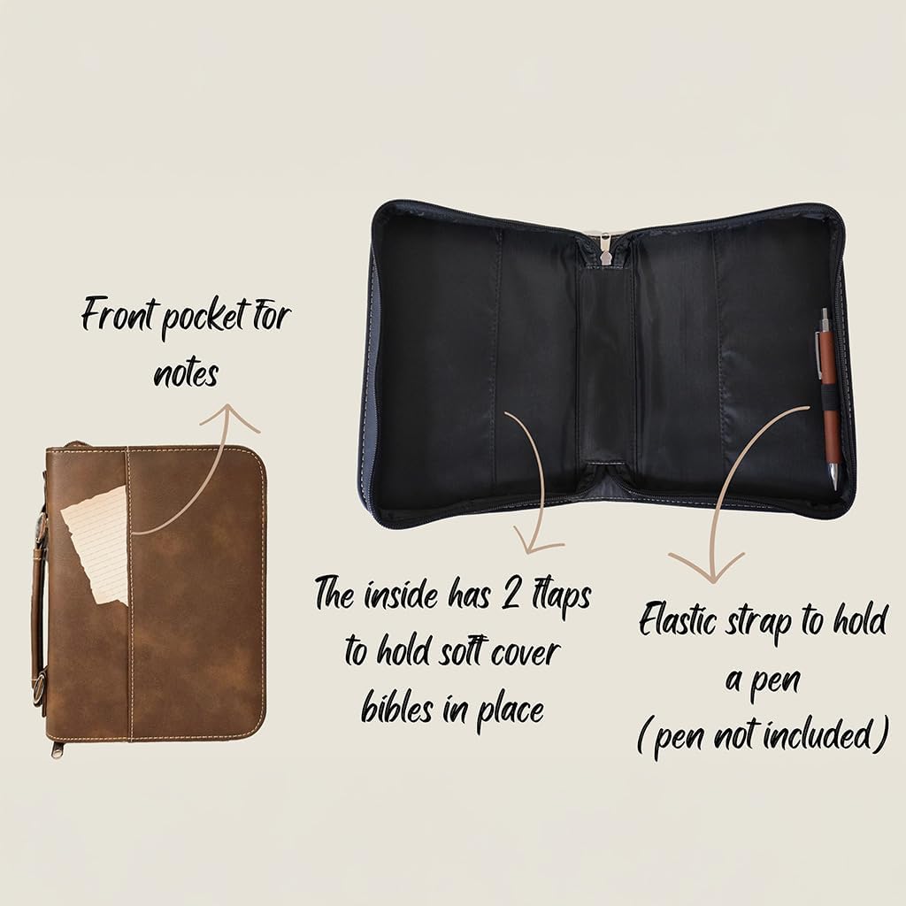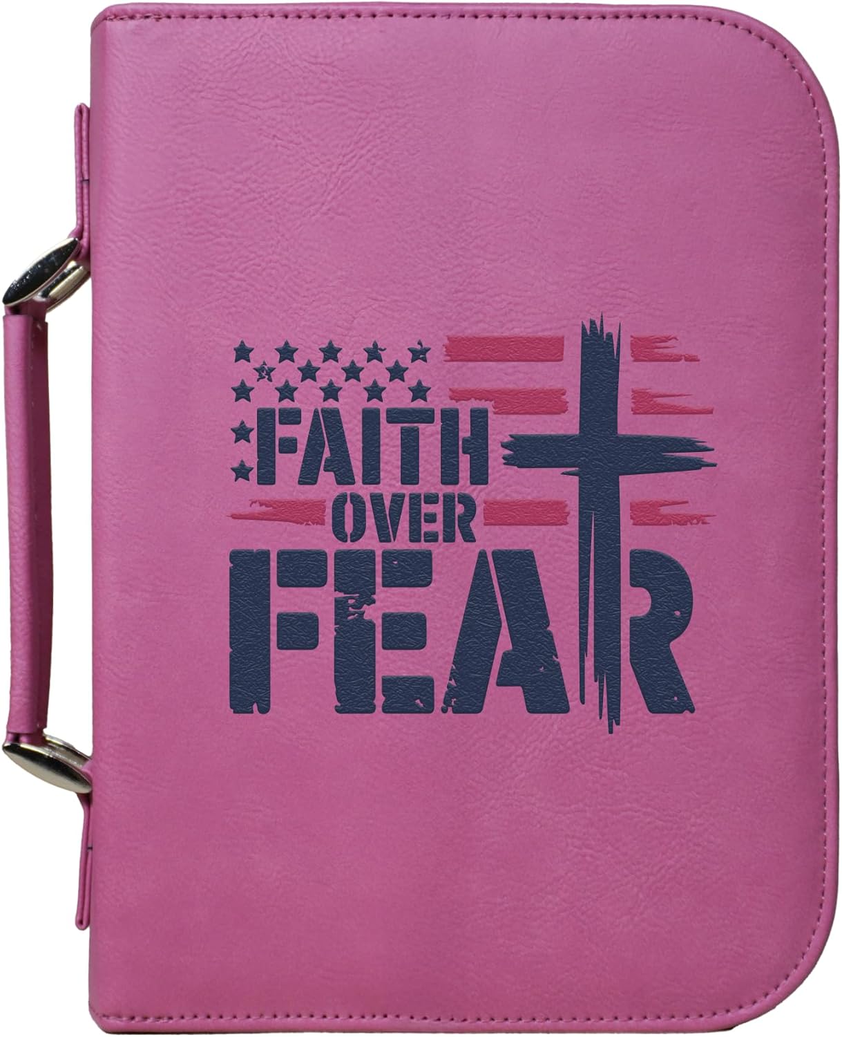Carry your Bible with confidence in this vegan leather “Faith Over Fear” cover, featuring a bold cross and flag design. Built for durability and daily use, this case offers a secure zippered closure to protect your Bible or Scripture journal. Inside, a pen holder and pocket keep study essentials neatly organized, while the sturdy handle makes it convenient to bring along to church, study groups, or travel. An inspiring accessory and a meaningful gift for anyone who treasures their faith.