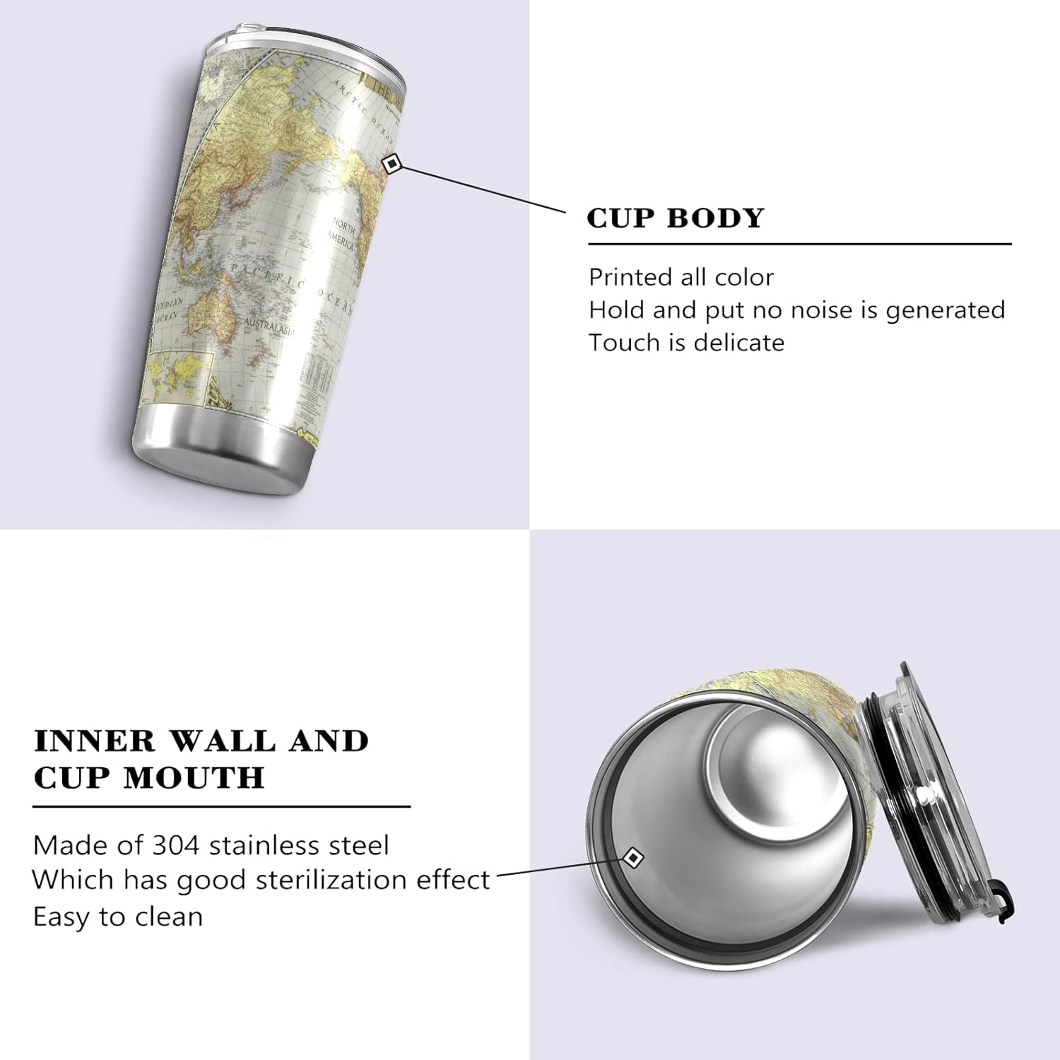 Insulated Stainless Steel Travel MugFeature- Wide mouth 3.3” opening--easy for cleaning and ice-filling- Keep cold up to 18 hours, and hot up to 6 hours- 100% non-toxic BPA-free- 18/8 food-grade stainless steel- Durable, easy-grip and sweat-free- Portable sizeGREAT FOR ANY OCCASIONOur Tumbler is suitable for any indoor or outdoor place. Perfect for enjoying drinks at home, on the beach, by the lake, at the pool, in the office, at the party, during RV tours, cabin trips, camping, hiking, picnic, BBQ.Instructions1. Minors please use under the guidance of adults or after reporting.2. Clean the inside and outside of the cup with neutral detergent in warm water before use.3. In order to achieve the best heat and cold preservation effect of the cup, it is recommended to add hot water or ice water for preheating or precooling. It is better to add ice cubes when keeping cold.4. To prevent leakage, please tighten the lid clockwise when the cup body is tilted.Note1. Add boiling water to the cup, do not use straws when drinking to prevent burns.2. When adding boiling water to the cup, it should not be too full to prevent overflow and scald.3. Avoid falling, collision or strong impact to cause the cup body to deform and affect the product's efficacy.4. Please use neutral detergent and warm water when cleaning, do not use alkaline bleach, chemical wipes and other cleaning agents.